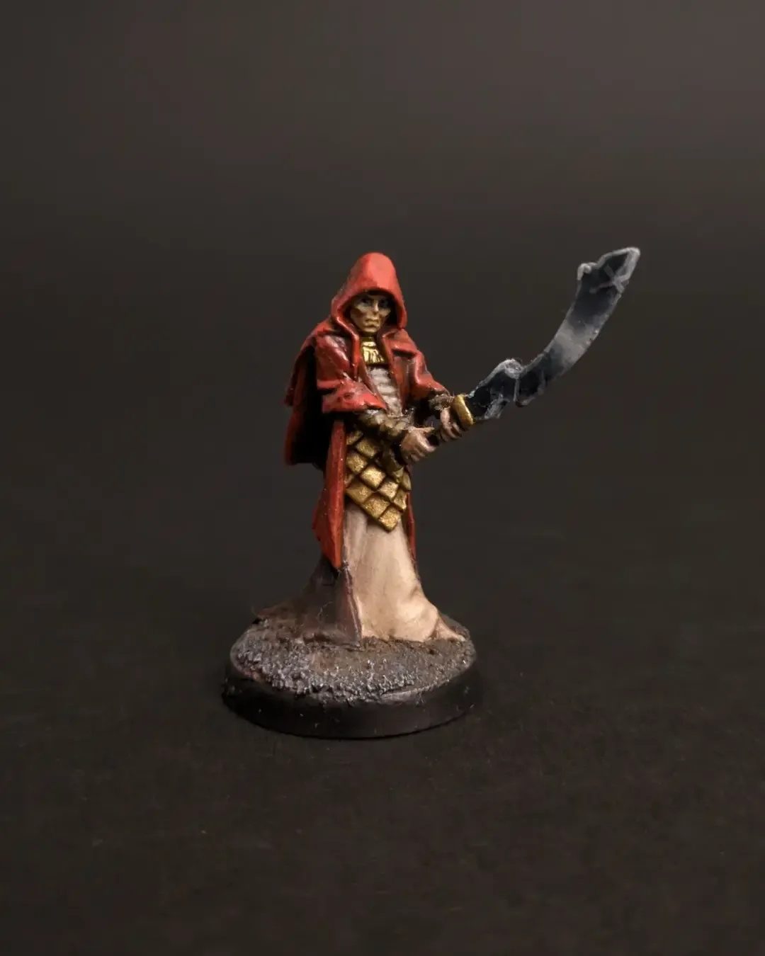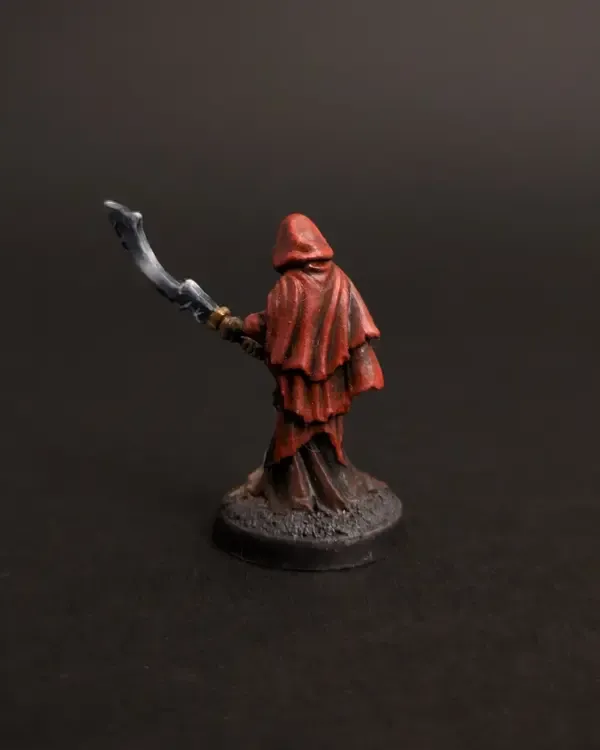This cultist from Reaper Bones was the first miniature I ever painted back in 2021. Spured by wanting to paint the characters in my copy of Gloomhaven I then watched a lot of Miniac (trying non-metaltic metal on my first go?), sat on it for ages, and then, when the niggling desire to start a whole new hobby didn't go away, I bought a starter set of Vallejo Game Colours and some cultists. I painted this over my kitchen table through the second lockdown.